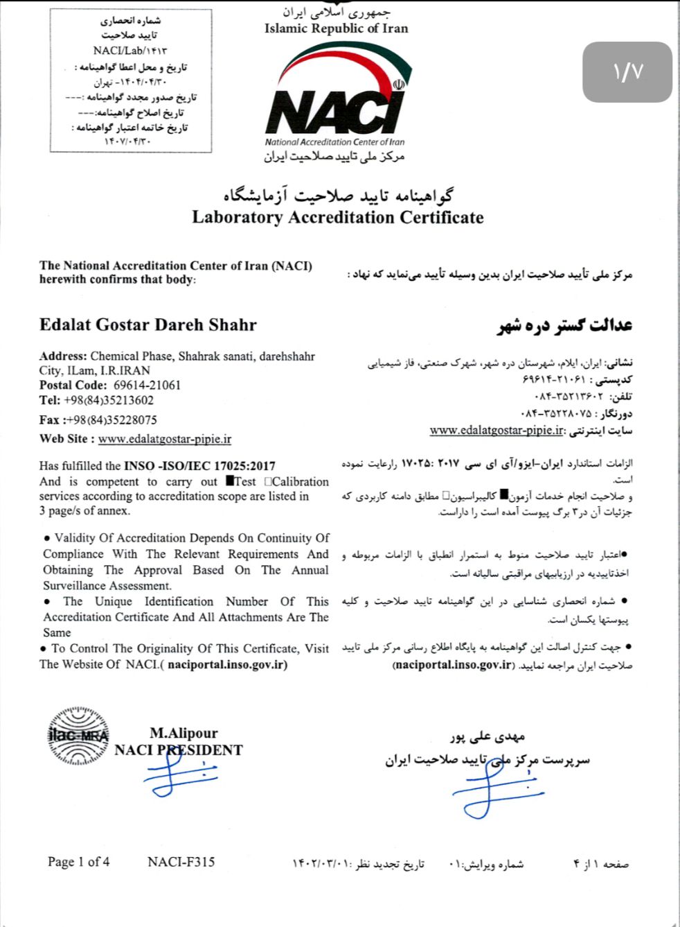 آزمایشگاه کنترل کیفی عدالت گستر دره شهر یک واحـد کاملا مستقل میباشد که توانایی آنالیز و آزمایش انواع لوله پلی اتیلن تکجداره را داراست و این آزمایشگاه به دستگاههای مدرن اندازهگیری و آزمایش (لوله پلی اتیلن) مجهز شدهاند و کلیه تولیدات و مواد اولیه را مطابق استانداردها آزمایش میکند و میتواند مرجع مطمئنی برای تصمیم گیری کیفی محصولات تولیدی عدالت گستر دره شهر باشد. قابل ذکر است آزمایشگاه عدالت گستر دره شهر دارای استاندارد 17025 میباشد که نشاندهنده کالیبره بودن تجهیزات و استاندارد بودن ادوات است و صلاحیت آزمایشگاه را جهت انجام آزمایش محصولات و صحت نتایج بدست آمده را تائید میکند. همچنین صلاحیت آزمایشگاه عدالت گستر دره شهر به عنوان آزمایشگاه همکار سازمان استاندارد به تائید رسیده است و آزمایشگاه همکار عدالت گستر دره شهر که در محل کارخانه ( شهرک صنعتی دره شهر) مستقر میباشد، از سوی اداره کل استاندارد ارزیابی و صلاحیت علمی و عملیاتی آن ها به عنوان “آزمایشگاه همکار” تائید گردیده است. تولید لوله و انواع لوله پلی اتیلن باید زیر نظر آزمایشگاه و واحد کنترل کیفیت باشد تا لوله نهایی دارای کیفیت بالایی باشد و در محل پروژه بتوانند با بالاترین استانداردهای موجود در تولید لوله به سرویس دهی مشغول شود